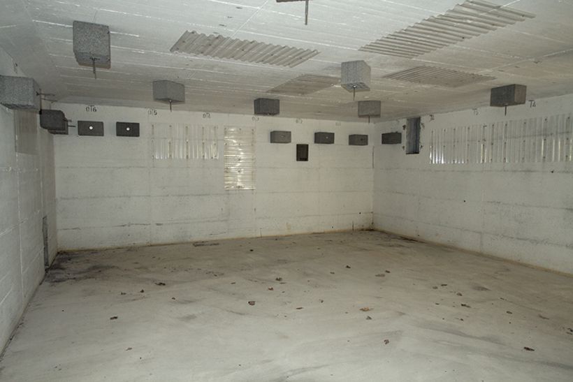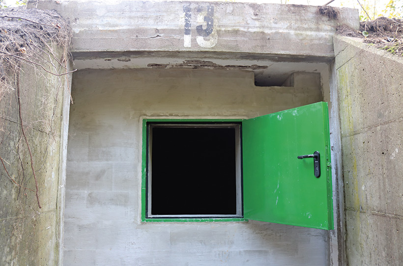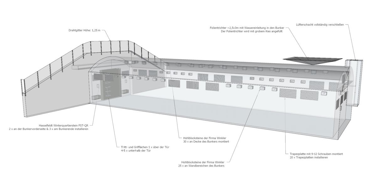 Inzwischen sind die alten Bunkereingänge zugemauert. Nur noch kleine, mit schweren Stahltüren gesicherte Einstiegsluken ermöglichen den Zugang. Durch schmale Öffnungen, die für die künftigen Bewohner im Mauerwerk ausgespart wurden, können wir dennoch einen Blick ins Innere werfen. Kühle Luft schlägt uns entgegen. An den Wänden sind Trapezplatten und Holzbetonkästen zu erkennen. Sie dienen den Fledermäusen als Versteck, ebenso die Kammerlochsteine an der Decke. Fledermäuse verkriechen sich zum Winterschlaf gern in Spalten und Ritzen. Nur ein Teil der Tiere hängt frei und ungeschützt an Wänden und Decken.